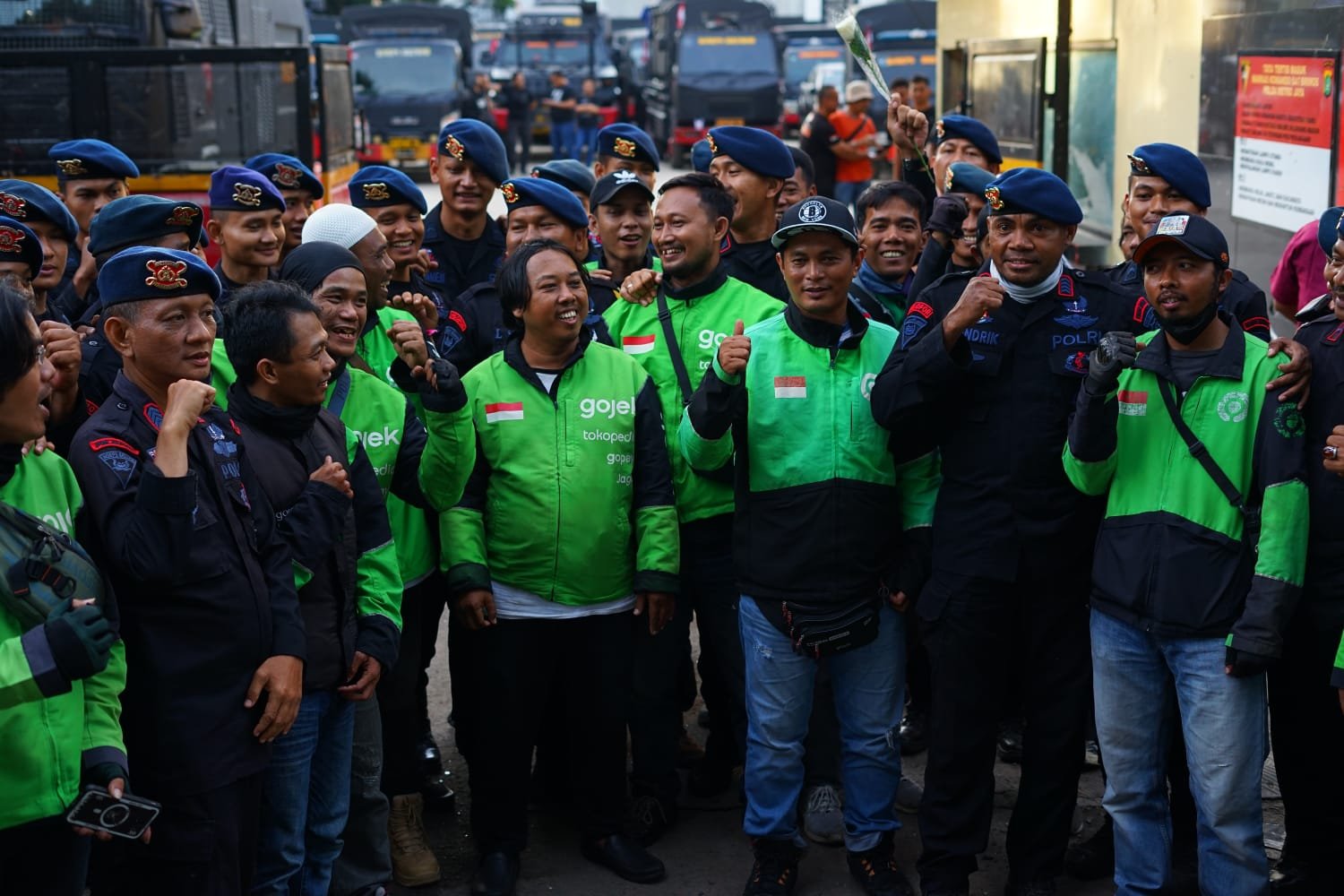 Jakarta, 29 Agustus 2025 – Suasana penuh kehangatan terlihat di Mako Brimob Polda Metro Jaya, Kwitang, ketika puluhan pengemudi ojol melakukan aksi damai. Dalam kegiatan tersebut, para pengemudi ojol bersalaman dan memeluk personel Brimob sebagai simbol persaudaraan.