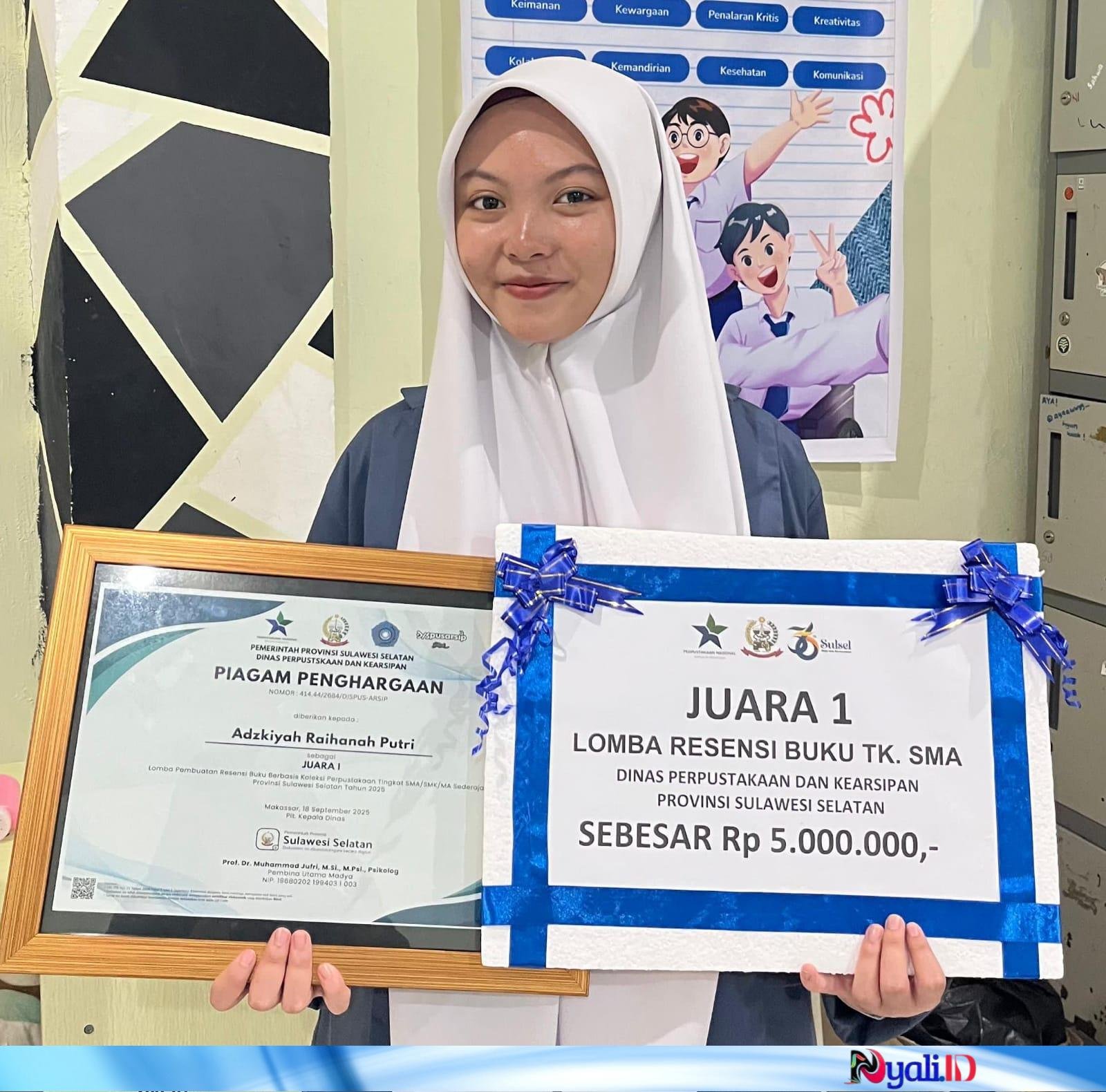Makassar,Nyali.id–Alhamdulillah, kabar membanggakan datang dari SMAIT Darul Fikri Makassar.Ananda Adzkiyah Raihanah Putri, siswi kelas XI, berhasil meraih Juara 1 Lomba Resensi Buku Tingkat SMA yang diselenggarakan oleh Dinas Perpustakaan dan Kearsipan Provinsi Sulawesi Selatan.