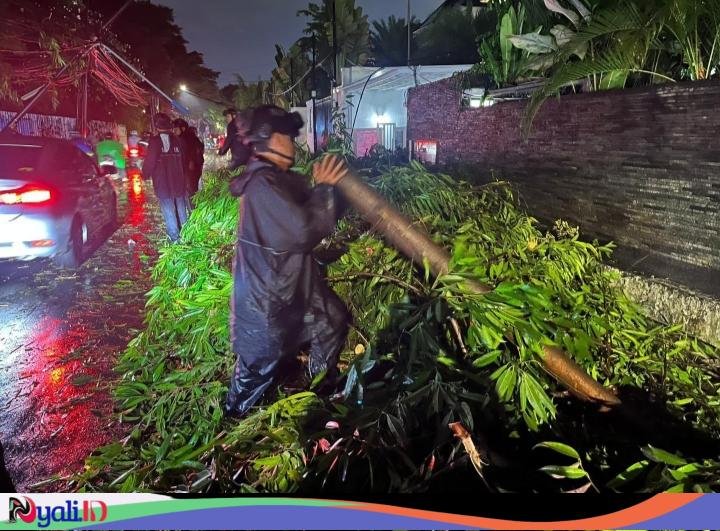 Jakarta — Personel Unit Patroli Brimob (Patra) Satbrimob Polda Metro Jaya bertindak cepat mengevakuasi pohon tumbang yang menghalangi jalan di Jl. Damawangsa X, Kebayoran Baru, Jakarta Selatan pada Kamis (30/10) sekitar pukul 18.30 WIB.