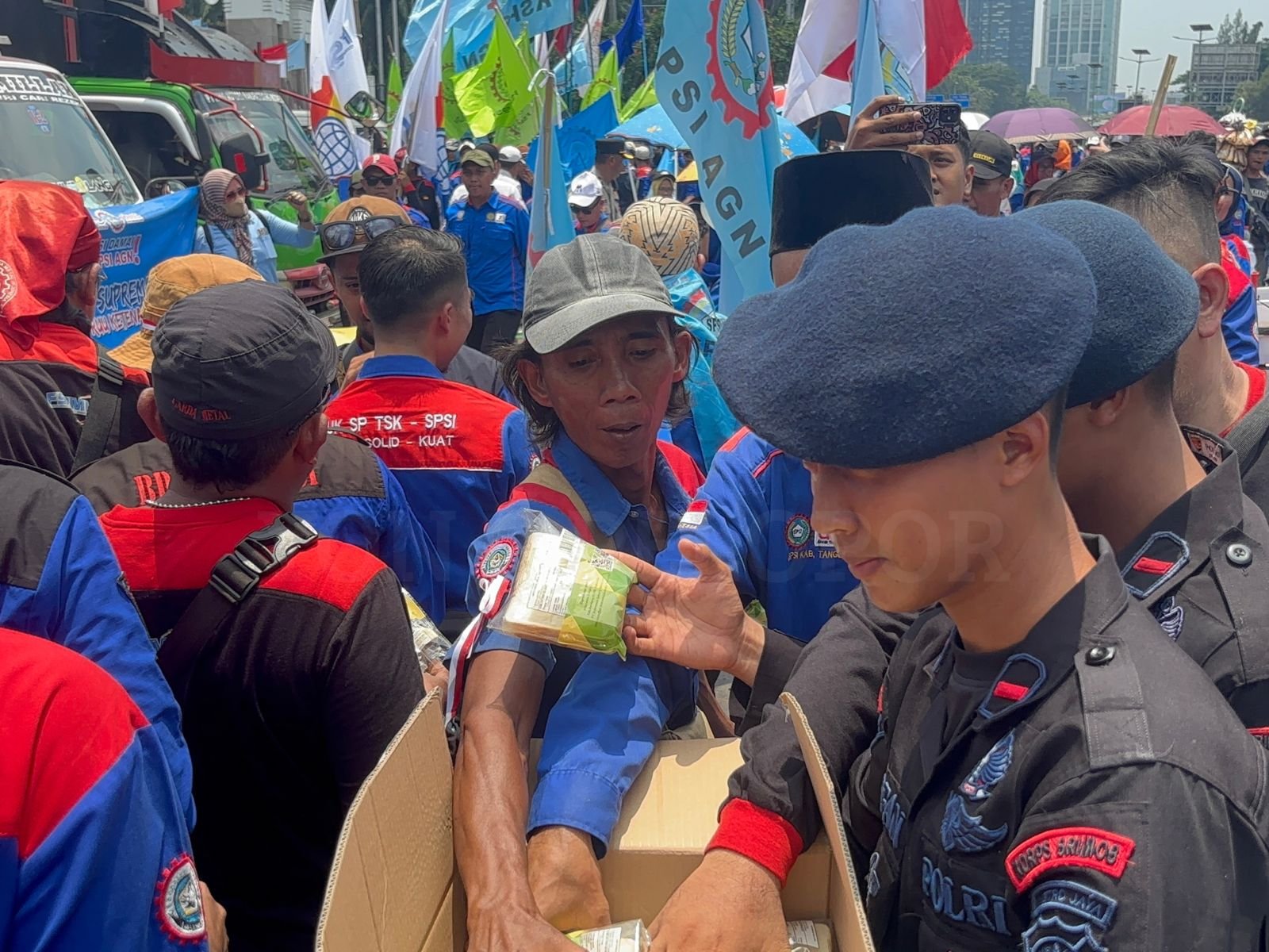 Jakarta – Wujud kepedulian ditunjukkan jajaran Sat Brimob Polda Metro Jaya saat mengawal jalannya aksi unjuk rasa hari ini. Tak hanya fokus menjaga ketertiban, para personel juga membagikan roti dan air minum kepada massa sebagai bentuk empati.
