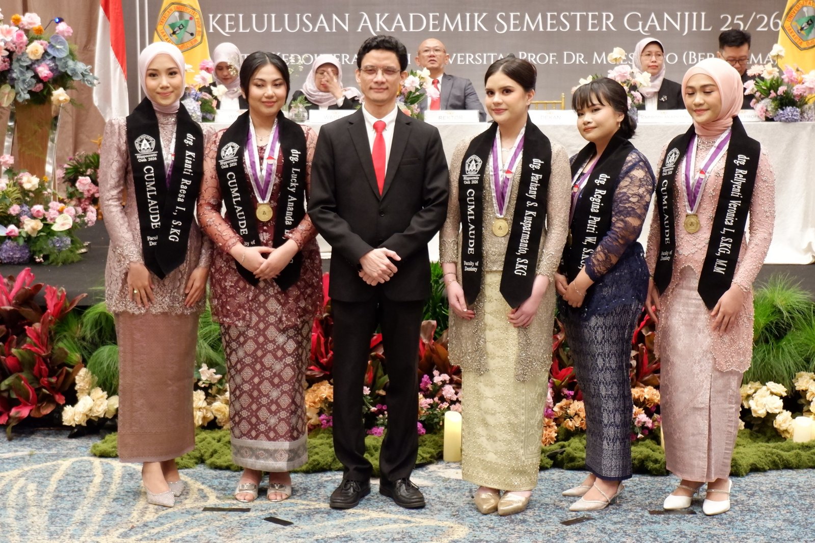 Sementara itu, perwakilan orang tua lulusan, dr. Riadhi Yulianto, Sp.B.Subsp.Onk(K)., SE., MBA, menyampaikan pesan agar para dokter gigi baru tidak berhenti belajar meskipun telah menyelesaikan pendidikan formal.