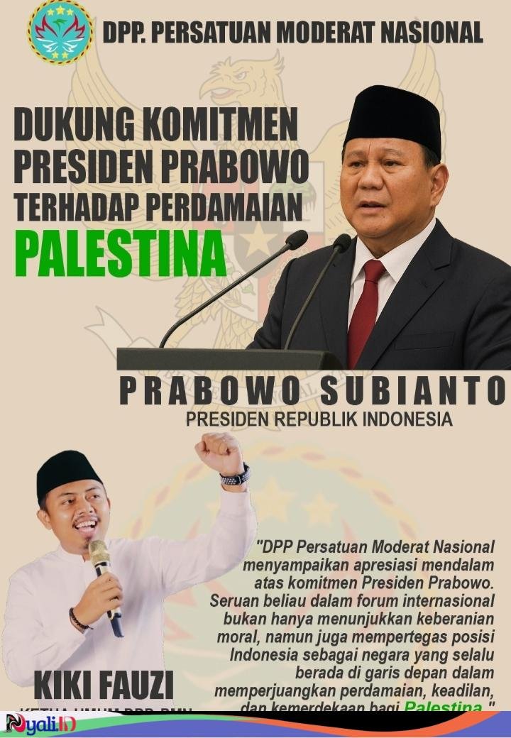 _“DPP Persatuan Moderat Nasional menyampaikan apresiasi mendalam atas komitmen Presiden Prabowo. Seruan beliau dalam forum internasional bukan hanya menunjukkan keberanian moral, namun juga mempertegas posisi Indonesia sebagai negara yang selalu berada di garis depan dalam memperjuangkan perdamaian, keadilan, dan kemerdekaan bagi Palestina,”_ ujar Kiki Fauzi.