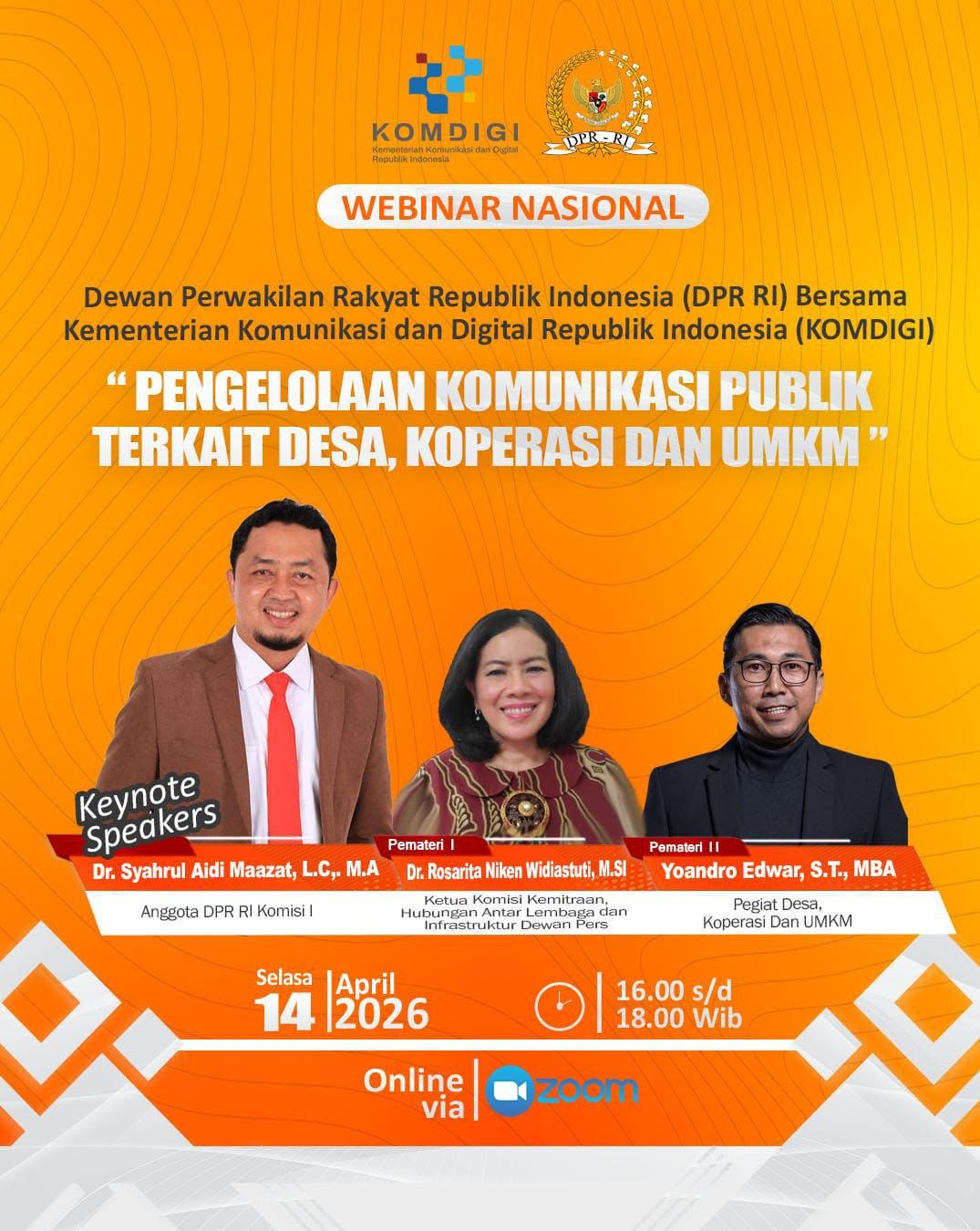 JAKARTA – Pemerintah terus memperkuat komitmen dalam membangun ekonomi kerakyatan melalui pengembangan sektor desa, koperasi, dan usaha mikro, kecil, dan menengah (UMKM). Hal ini mengemuka dalam Webinar Nasional yang diselenggarakan oleh Kementerian Komunikasi dan Digital (Komdigi) bersama Komisi I DPR RI, Selasa (14/4/2026).