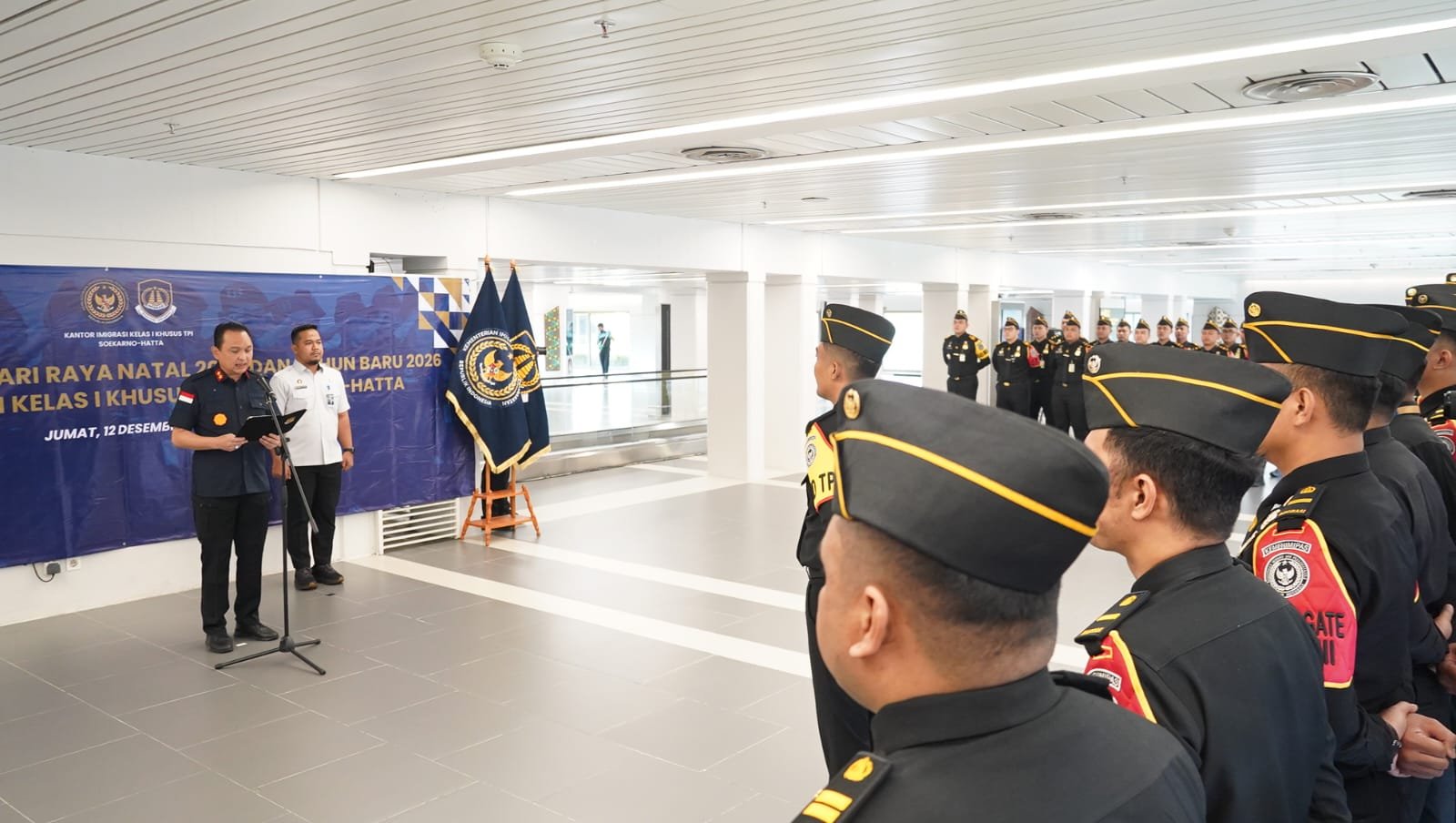 Tangerang — Dalam rangka menjamin keamanan, ketertiban, dan kelancaran proses pelayanan Keimigrasian dan Pemeriksaan keimigrasian pada Tempat Pemeriksaan Imigrasi Soekarno-Hatta menjelang Hari Raya Natal 2025 dan Tahun Baru 2026, Kantor Imigrasi Kelas I Khusus TPI Soekarno-Hatta melakukan langkah-langkah penguatan pelayanan, kesiapan personel, optimalisasi sistem teknologi informasi, dan peningkatan pengawasan di seluruh titik strategis sebagai bagian dari kesiapsiagaan menghadapi masa libur akhir tahun. Salah satu langkah tersebut diwujudkan melalui penyelenggaraan Apel Kesiapsiagaan yang dilaksanakan pada Jumat, 12 Desember 2025, bertempat di Terminal 2 Kedatangan, Bandar Udara Internasional Soekarno-Hatta.