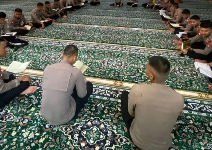Jakarta – Personel Batalyon B Pelopor Kompi 4 Satuan Brimob Polda Metro Jaya menggelar tadarus Al-Qur’an di Mapolda Metro Jaya, Rabu (4/3/2026). Agenda tersebut dilaksanakan di sela tugas siaga sebagai cadangan Kompi Komposit dengan tetap mengedepankan kesiapan operasional.