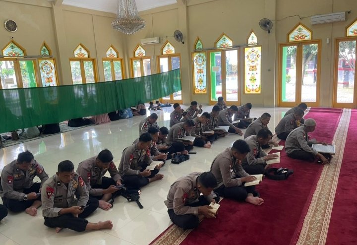 Kegiatan yang dimulai pada pukul 08.00 WIB tersebut dilaksanakan setelah apel pagi. Personel yang tidak terploting dalam penugasan bersama Ibu Bhayangkari mengikuti tadarus Al-Qur’an dengan penuh khidmat sebagai bagian dari pembinaan rohani dan mental.