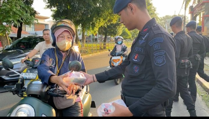 Personel Brimob dan ibu-ibu Bhayangkari tampak kompak turun ke jalan membagikan ratusan paket takjil kepada para pengguna jalan dan warga sekitar yang melintas. Aksi sosial ini mendapatkan sambutan hangat dari masyarakat yang kebetulan sedang dalam perjalanan menjelang waktu berbuka puasa.